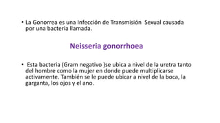 La gonorrea es una infección de transmisión sexual causada por la bacteria Neisseria gonorrhoeae, la cual se ubica en la uretra, recto, conjuntiva y faringe. Los síntomas en hombres incluyen secreciones y dolor al orinar, mientras que en mujeres a menudo es asintomática. El diagnóstico definitivo requiere cultivo bacteriano y la tinción de Gram, y el tratamiento efectivo es con antibióticos.