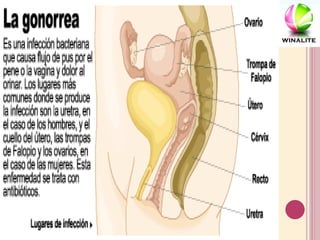 La gonorrea es una infección de transmisión sexual causada por la bacteria Neisseria gonorrhoeae que infecta la mucosa de la uretra, cuello uterino, recto y garganta. Los síntomas incluyen dolor al orinar, secreciones anormales y dolor pélvico y aparecen entre 2-21 días después del contacto sexual. Si no se trata, puede causar enfermedades como la enfermedad pélvica inflamatoria y esterilidad. Se diagnostica y trata mediante antibióticos como ceftriax