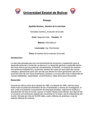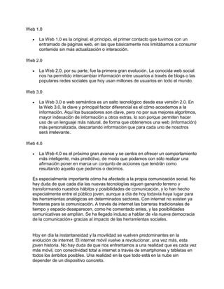 El documento describe la evolución de la web desde la Web 1.0 hasta la Web 4.0, incluyendo las características clave de cada versión. También discute cómo las nuevas tecnologías continúan transformando los hábitos de comunicación y conectividad, especialmente a través de dispositivos móviles. Concluye que la innovación y el impacto de la movilidad serán fundamentales para el futuro de Internet, y que éste seguirá ofreciendo numerosas ventajas para el desarrollo individual.