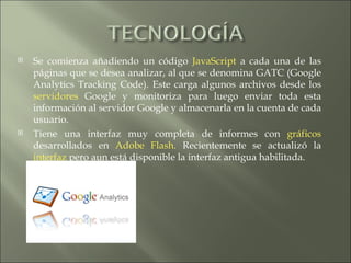 Google Analytics es una solución de analítica web que proporciona información valiosa sobre el tráfico y la eficacia del marketing a través de funciones flexibles y fáciles de usar. Se implementa añadiendo código JavaScript a las páginas para monitorizar el tráfico y enviar la información a los servidores de Google. Las herramientas de análisis SEO como POPURI, RAVEN y WEBSITEGRADER proveen reportes con métricas como PageRank, enlaces, tráfico y posicionamiento para ayudar a mejorar el sit