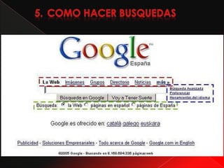Google es el buscador más popular de Internet que permite a los usuarios acceder fácilmente a una gran cantidad de información. Ofrece diversos servicios gratuitos como Gmail, Google Maps, Google Traductor y Google Drive que facilitan el aprendizaje y la productividad. Los usuarios pueden realizar búsquedas básicas en la página principal de Google o llevar a cabo búsquedas más avanzadas utilizando operadores lógicos.
