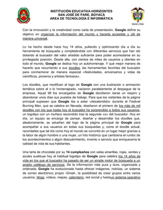 Google celebró su 14 aniversario con un doodle en forma de pastel de chocolate. La compañía fue fundada en 1998 por Larry Page y Sergey Brin, dos estudiantes de la Universidad de Stanford, en un garaje en Silicon Valley. Desde entonces, Google ha evolucionado de un motor de búsqueda simple a una amplia gama de servicios como Gmail, Google Maps, YouTube y Android.