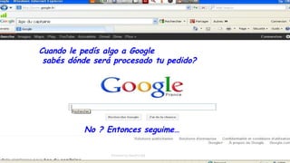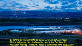 El centro de procesamiento de datos de Google se encuentra en Dalles, Oregon, donde ocupa 10,700 metros cuadrados optimizados para procesar solicitudes de búsqueda de Google y YouTube de manera rápida. La sala de servidores alberga computadoras refrigeradas y ventiladores, e iluminada con luces LED verdes y amarillas, que procesan datos para usuarios en todo el mundo.
