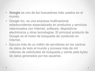 Google es uno de los buscadores más utilizados en el mundo y es una empresa multinacional estadounidense especializada en productos y servicios relacionados con Internet. Procesa más de mil millones de solicitudes de búsqueda diarias a través de más de un millón de servidores en centros de datos en todo el mundo. Fue fundada en 1998 en California por Sergey Brin y Larry Page.