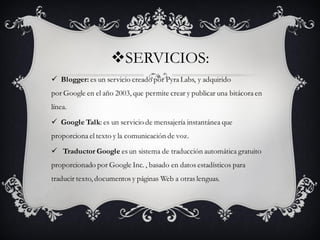 Google ofrece varios servicios como Blogger para blogs, Google Talk para mensajería, Traductor de Google, Google Drive para almacenamiento en la nube, el navegador Chrome, YouTube para videos, el sistema operativo Android, Google Earth para mapas, y Gmail para correo electrónico. SmartArt en PowerPoint permite modificar rápidamente gráficos y formas mediante menús contextuales y ofrece varias formas, plantillas, combinaciones de imágenes y formas, e inventar nuevas formas.