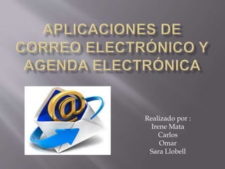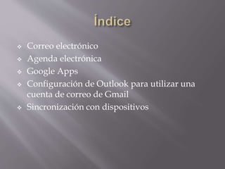Este documento describe cómo crear y configurar una cuenta de correo electrónico de Gmail, las características de Gmail, cómo configurar Microsoft Outlook para usar una cuenta de Gmail, y cómo sincronizar contactos y calendarios entre un teléfono móvil y Outlook.