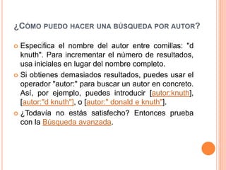 Este documento proporciona instrucciones sobre cómo realizar diferentes tipos de búsquedas en Google Académico, incluyendo búsquedas por autor especificando el nombre entre comillas o usando el operador "autor:", búsquedas por título entre comillas, encontrar investigaciones recientes sobre un tema haciendo clic en "Artículos recientes" y buscar documentos en publicaciones específicas usando la Búsqueda avanzada. También explica que el enlace "Artículos relacionados" muestra documentos relacionados al resultado de bú