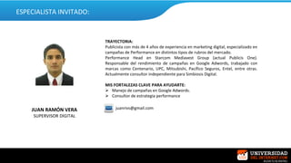 Este documento presenta un resumen de un taller de certificación de Google Adwords. Se introduce al experto invitado, Juan Ramón Vera, quien tiene experiencia en marketing digital y campañas de rendimiento en Google Adwords. Luego, se repasan conceptos básicos de Adwords como tipos de ofertas, niveles de cuenta y campaña, grupos de anuncios, y concordancias. Finalmente, se explican segmentaciones para display como intereses, datos demográficos, temas y ubicaciones.