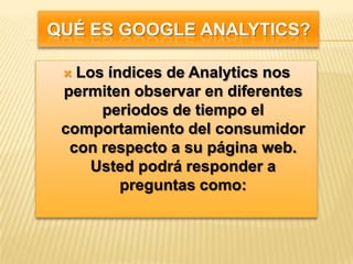 Este documento proporciona una introducción a Google Analytics, una herramienta gratuita que permite observar el comportamiento de los visitantes de un sitio web mediante métricas como el número de visitas, páginas vistas y palabras clave de búsqueda utilizadas. Luego explica los 10 pasos principales para instalar Google Analytics en un sitio web de WordPress y comenzar a utilizar sus funciones como informes de tráfico, integración con AdWords y seguimiento de conversiones de comercio electrónico.