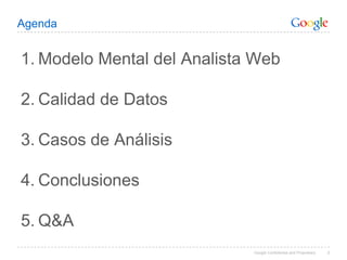El documento presenta una introducción a Google Analytics. Explica la importancia de la calidad de datos, el análisis de tráfico, eficiencia y sitios de branding. También cubre casos de análisis como embudos de conversión multicanal y el proceso de toma de decisiones. Sus principales conclusiones son que el objetivo es optimizar más que medir, la importancia de datos de calidad y que un análisis efectivo aumenta ingresos, reduce costos y fomenta la lealtad.