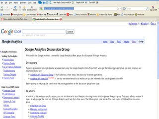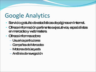 Google Analytics es un servicio gratuito de estadísticas de páginas web que ofrece información relevante sobre el tráfico y el comportamiento de los usuarios a ejecutivos, especialistas en mercadeo y webmasters. Utiliza código JavaScript para recopilar datos sobre usuarios, campañas de marketing, motores de búsqueda y navegación que luego almacena y presenta en una variedad de informes e gráficos para ayudar a analizar el tráfico en un sitio web.