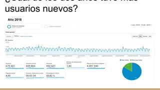 El documento resume los datos de usuarios y ventas de una empresa para los años 2018 y 2019 según Google Analytics. En 2018 hubo más usuarios totales y nuevos que en 2019. La generación Y fue responsable de casi el 50% de las ventas ambos años. Mientras que el tráfico de referidos lideró las ventas en 2018, lideró las menores ventas en 2019 con cambios significativos en los canales.