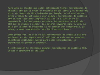 El documento describe el uso de herramientas de análisis SEO para obtener información sobre el entorno y optimizar sitios web. Explica que las herramientas de análisis SEO reducen el riesgo de errores al optimizar un sitio web, pero que el usuario debe decidir cómo aplicar los datos. También indica que existen diferentes herramientas gratuitas y de pago para sitios grandes y pequeños.
