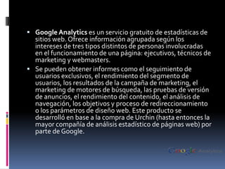 Google Analytics es un servicio gratuito de análisis web que ofrece información sobre el tráfico y el comportamiento de los usuarios en un sitio web. Proporciona informes detallados sobre métricas como usuarios únicos, rendimiento de campañas, análisis de contenido y navegación. Usa código JavaScript para recopilar datos y enviarlos a los servidores de Google para su almacenamiento y análisis.
