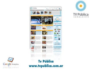 El resumen analiza las estadísticas de tráfico del sitio web de TV Pública durante agosto de 2010. Tuvo 553.792 visitas y 1.370.676 páginas vistas, con visitantes principalmente de Argentina, España y EEUU. Los contenidos más populares fueron el video en vivo, los programas y la sección de programación. El canal también tuvo tráfico en YouTube, Facebook y Twitter.