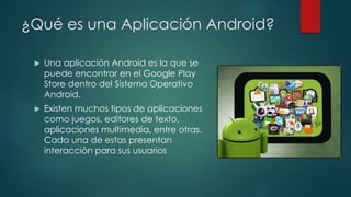 App Inventor es una herramienta de Google para crear aplicaciones Android de forma visual mediante bloques. Los usuarios pueden diseñar interfaces y definir el comportamiento de las aplicaciones sin necesidad de código. La herramienta es gratuita y fácil de usar, permitiendo crear aplicaciones funcionales en poco tiempo.