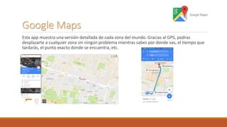 Este documento describe varias aplicaciones de Google, incluyendo Google Maps que muestra mapas detallados del mundo y permite navegar con GPS, Google Play que es una tienda de aplicaciones para móviles, Google Drive que ofrece almacenamiento en la nube de archivos y Google Calendar y Docs que permiten crear calendarios y documentos compartidos.