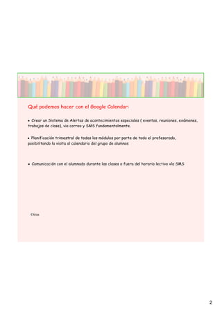 Google Calendar permite crear eventos y recordatorios, planificar el curso escolar, comunicarse con estudiantes, y compartir calendarios. Los usuarios pueden crear cuentas de Gmail para acceder a Calendar, añadir eventos, recibir notificaciones por correo electrónico o SMS, e invitar a otros a eventos. El calendario ofrece una forma efectiva de organizar el horario escolar.