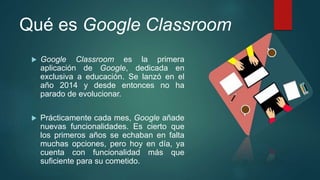 Google Classroom es una plataforma de gestión del aprendizaje lanzada en 2014 por Google que permite a profesores crear clases, asignar tareas, y comunicarse con estudiantes de forma gratuita y en línea. Los estudiantes pueden acceder a materiales de clase, completar trabajos, y recibir comentarios de cualquier dispositivo. Google Classroom ofrece ventajas como comunicación mejorada, ahorro de papel, y organización de recursos educativos de forma sencilla para profesores y estudiantes.