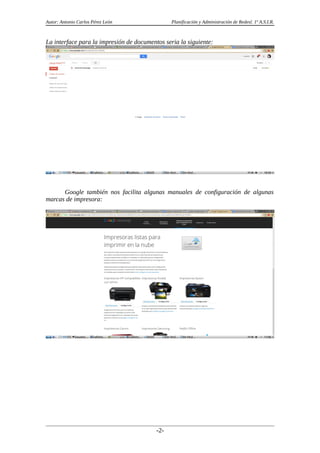 Google Cloud Print es una tecnología que permite imprimir documentos desde cualquier dispositivo con conexión a Internet utilizando impresoras conectadas a la web. El documento describe cómo añadir un dispositivo móvil como impresora virtual y enviar documentos para su impresión desde la interfaz de Google Cloud Print. También menciona algunas alternativas a este servicio como Hpprint e Pixma Cloud Link, aunque estas están limitadas a impresoras de una sola marca.