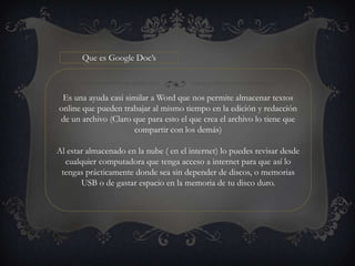 Google Docs es una herramienta en línea que permite almacenar y editar documentos de texto en la nube, lo que significa que se pueden acceder y editar los archivos desde cualquier computadora con acceso a Internet. Esto es útil para trabajar en documentos de forma colaborativa en tiempo real con otros usuarios o cuando no se tiene instalado Microsoft Word. Aunque es similar a Word, Google Docs aún le falta funcionalidad para igualar la potencia de las suites de oficina locales.