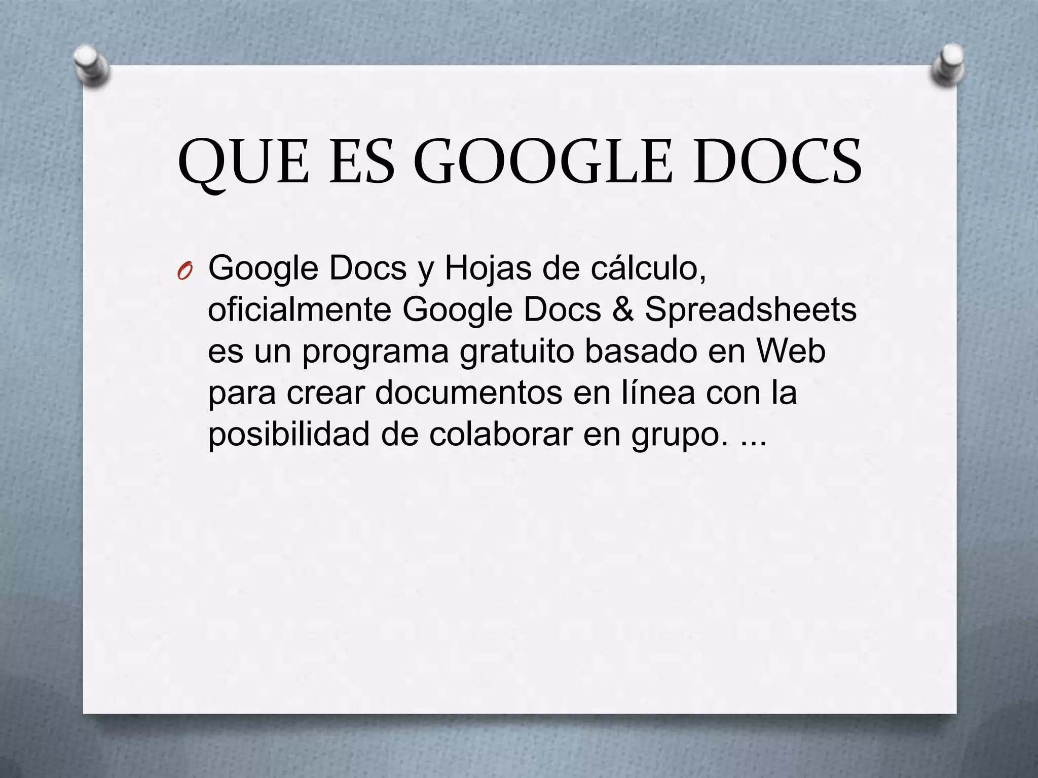 Google Docs es un programa gratuito basado en la web para crear y editar documentos en línea de forma colaborativa. Ofrece ventajas como permitir subir archivos, consultar información, comunicarse de forma económica, pero también tiene desventajas como ser a veces complicado de manejar y contener información errónea.