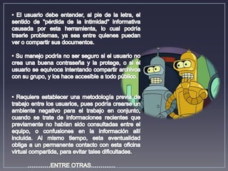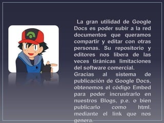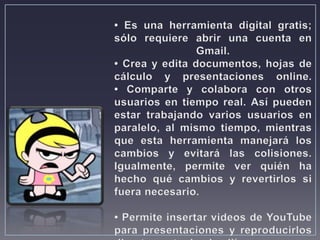 El documento proporciona 4 enlaces a sitios web que contienen información sobre Google Docs, incluyendo sus ventajas y desventajas.