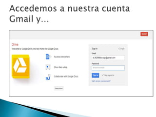 El documento explica los pasos para crear y compartir un documento en Google Docs. Primero se debe dar clic en la pestaña Drive, luego en Crear para seleccionar el tipo de documento deseado. Una vez creado el documento, se pueden usar las herramientas disponibles y finalmente compartirlo seleccionando la opción de compartir para elegir cómo hacerlo.