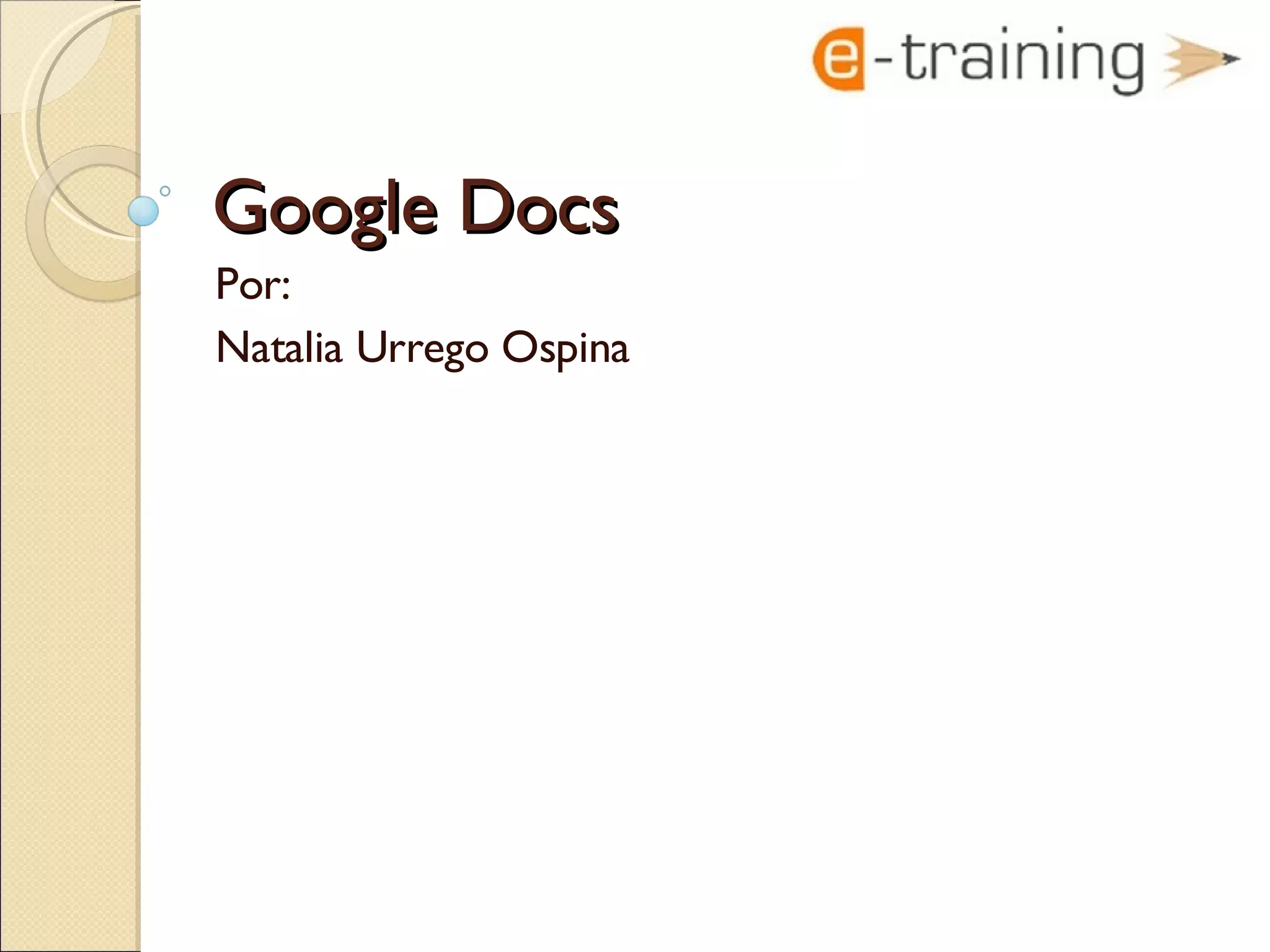 Google Docs es una herramienta en línea que permite crear documentos, hojas de cálculo y presentaciones. Permite a varios usuarios editar un documento al mismo tiempo y ver el historial de cambios. Los usuarios pueden acceder a los documentos desde cualquier lugar con conexión a Internet y compartirlos con otros.