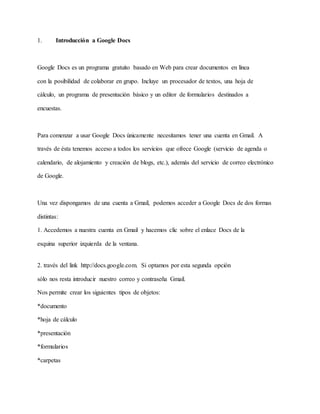 Google Docs es un programa gratuito basado en la web que permite crear y editar documentos, hojas de cálculo y presentaciones en línea de forma colaborativa. Requiere una cuenta de Gmail para acceder a los servicios de Google Docs, donde se pueden crear, abrir y guardar documentos, hojas de cálculo y presentaciones, así como subir archivos PDF para su almacenamiento y acceso en línea. El documento explica los tipos de objetos que se pueden crear en Google Docs y cómo editar documentos de texto mediante funciones como cop