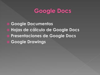 Google Docs permite crear documentos, hojas de cálculo, presentaciones y dibujos desde la nube o importar archivos existentes. Los archivos se almacenan automáticamente en los servidores de Google y pueden ser compartidos y editados en tiempo real por múltiples usuarios. Además, ofrece exportar y guardar copias de los archivos de forma local.