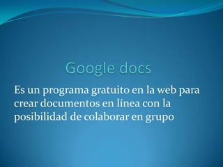 Google Docs es un programa gratuito en línea para crear y colaborar en documentos, hojas de cálculo y presentaciones. Los documentos de texto pueden tener hasta 500 kb y las imágenes incrustadas hasta 2MB. Cada hoja de cálculo puede tener hasta 10,000 filas y 256 columnas. Aunque el acceso seguro vía SSL no está habilitado por defecto, existe la opción de HTTPS, pero el login unificado de cuentas de Google representa un riesgo potencial para la privacidad de documentos sensibles.