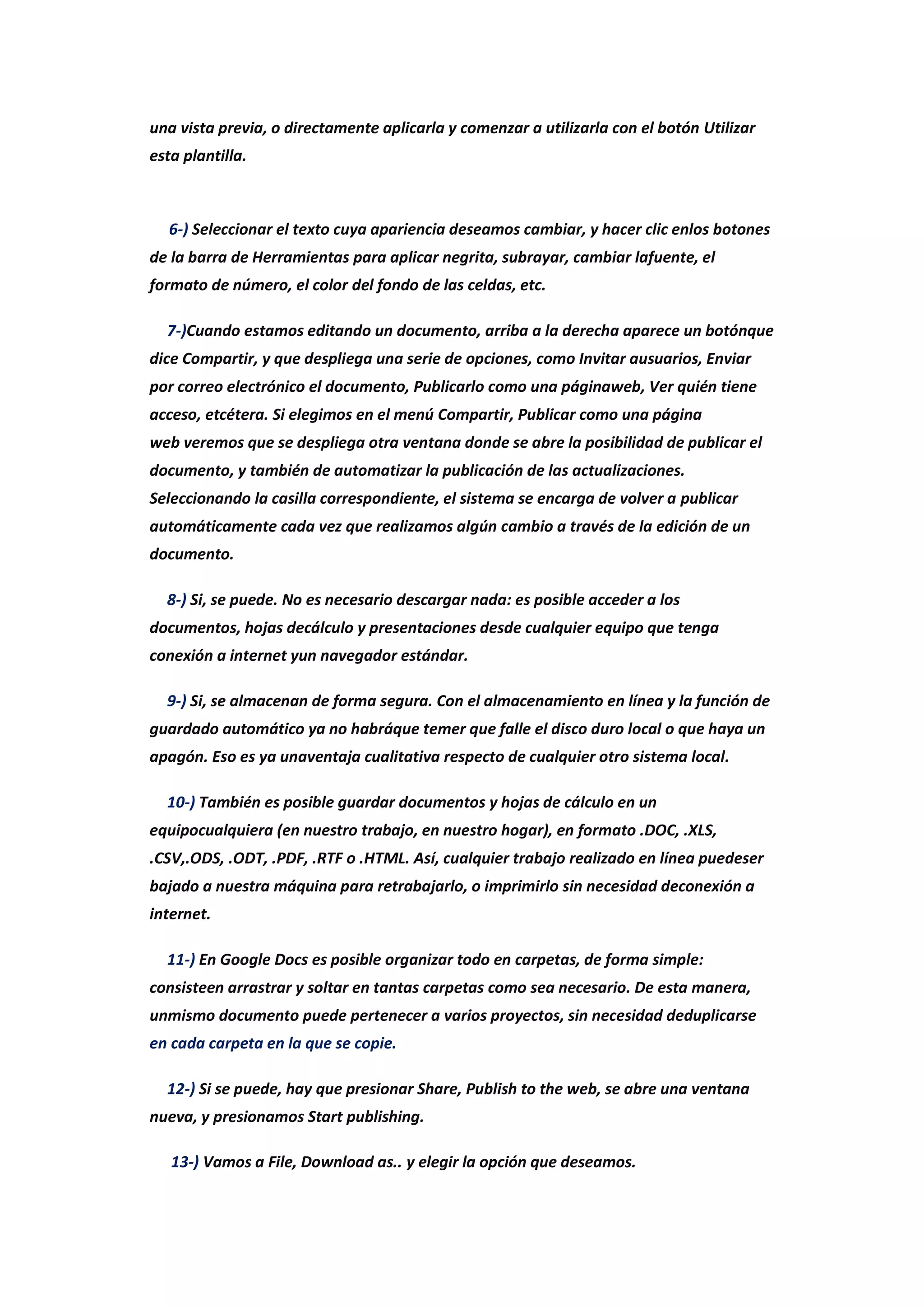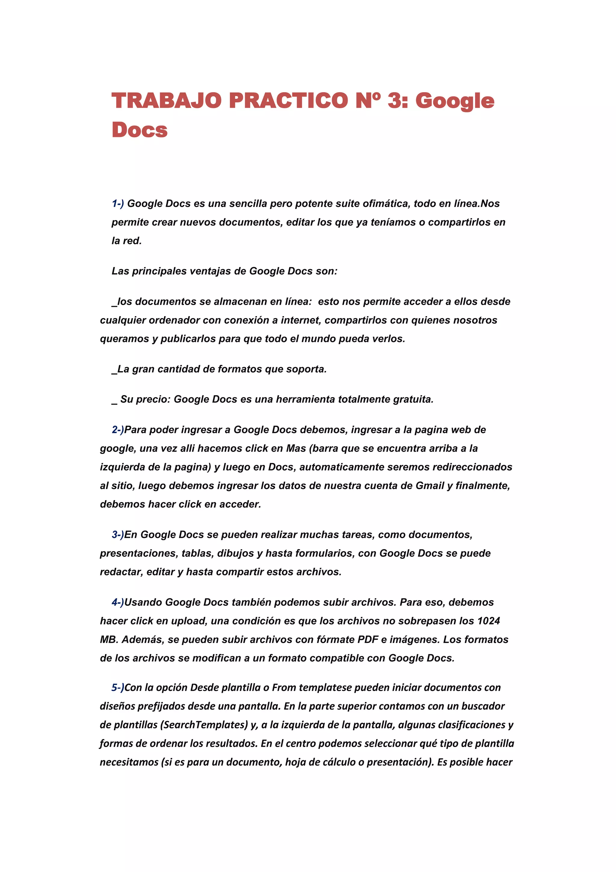 Google Docs es una suite de ofimática en línea gratuita que permite crear, editar y compartir documentos, hojas de cálculo y presentaciones desde cualquier dispositivo con conexión a Internet. Los archivos se almacenan en la nube de forma segura y están disponibles desde cualquier lugar. Además, permite editar documentos de manera colaborativa y publicar trabajos en línea para que sean accesibles a todo el público.