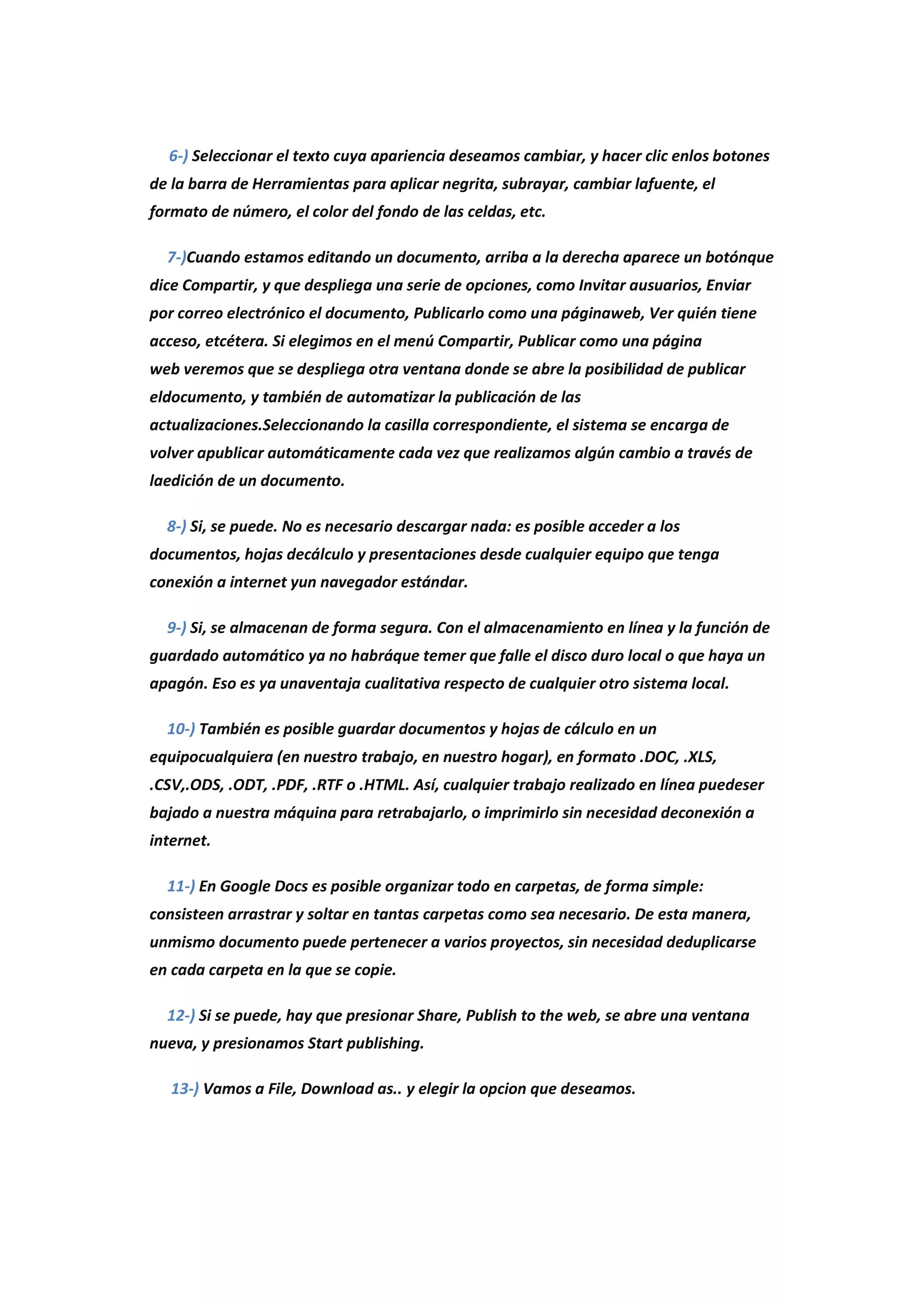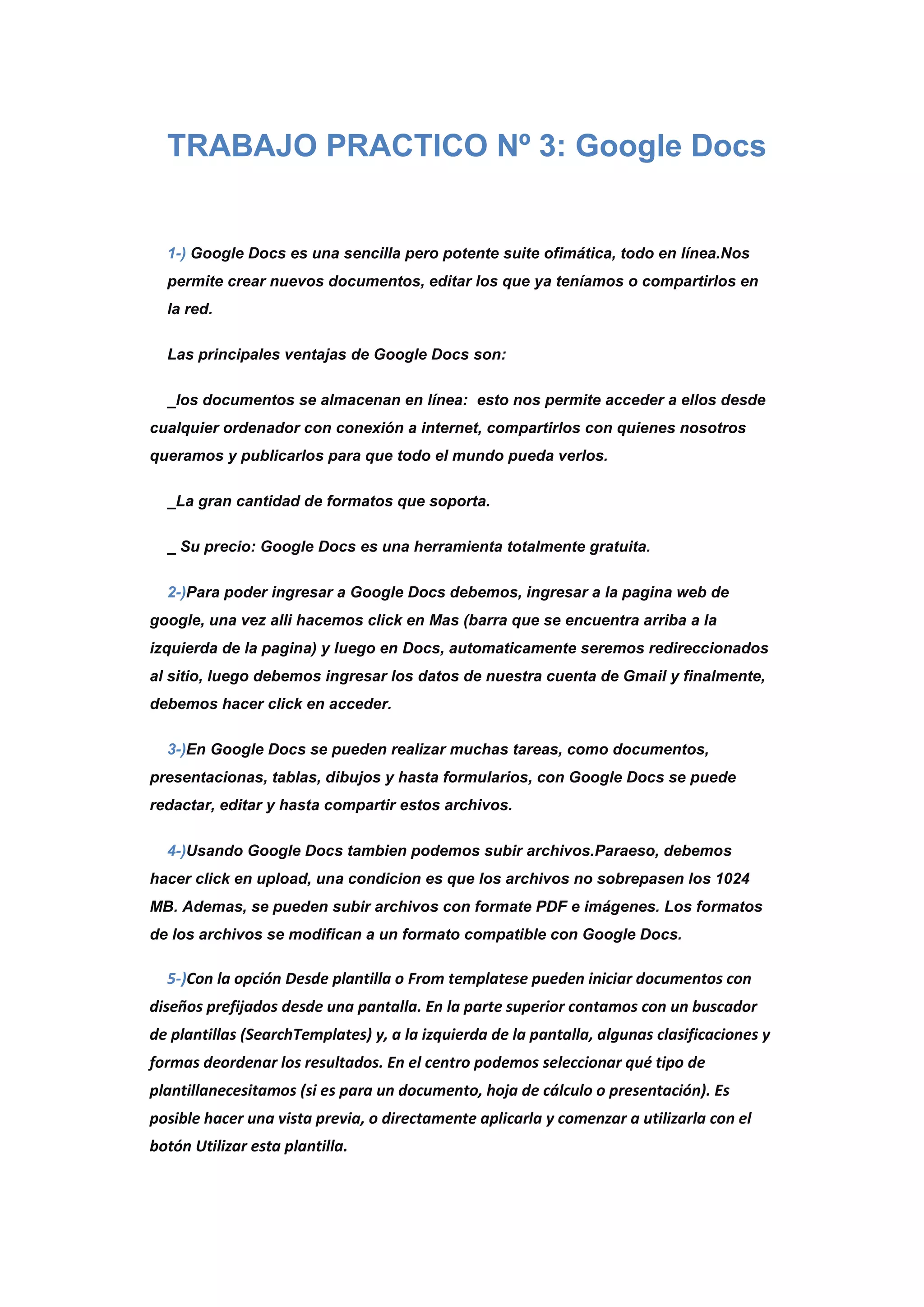 Google Docs es una suite de ofimática en línea gratuita que permite crear, editar y compartir documentos, hojas de cálculo y presentaciones desde cualquier dispositivo con conexión a Internet. Los archivos se almacenan en la nube de Google para permitir el acceso y la edición colaborativa en tiempo real desde cualquier lugar. Además, los documentos se pueden publicar públicamente o compartir de forma privada con otros usuarios.