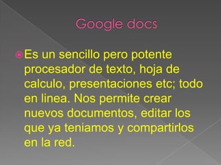Google Docs es una herramienta en línea gratuita que permite crear, editar y compartir documentos, hojas de cálculo y presentaciones desde cualquier ordenador, almacenando y guardando automáticamente los archivos en línea para que estén disponibles desde cualquier dispositivo con una cuenta de Gmail.