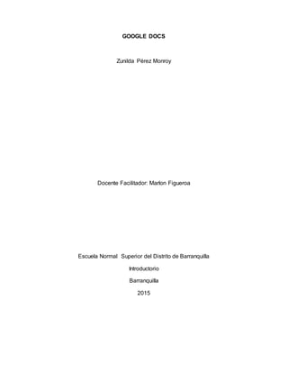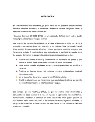 Google Docs es una herramienta gratuita en línea que permite a los usuarios crear, editar y compartir documentos, hojas de cálculo y presentaciones desde cualquier lugar con conexión a Internet. Ofrece funciones como formatos de texto, inserción de imágenes y tablas, colaboración en tiempo real con otros usuarios, historial de versiones y conversión de archivos de Microsoft Word. En el ámbito educativo facilita el compartir información de manera rápida, segura y fácil para mejorar la productividad en la elaboración de trabajos.