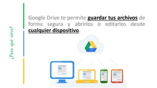 Google Drive permite a los usuarios guardar archivos de forma segura en la nube y abrirlos o editarlos desde cualquier dispositivo. Los usuarios pueden subir archivos desde su ordenador a su unidad de Google Drive o crear nuevos archivos directamente en Drive. También pueden compartir archivos y carpetas con otros y organizar sus archivos mediante la asignación de permisos y propiedad.