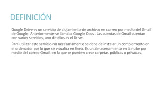 Google Drive es un servicio de almacenamiento en la nube de Google que permite a los usuarios crear, editar y compartir archivos desde cualquier dispositivo. Los usuarios pueden acceder a sus archivos de Drive a través de su cuenta de Gmail sin necesidad de instalar software adicional. Drive ofrece 15 GB de almacenamiento gratuito y permite a los usuarios colaborar en documentos en línea de forma sencilla.