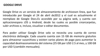 Google Drive es un servicio de almacenamiento en la nube lanzado por Google en 2012 que reemplazó a Google Docs. Los usuarios pueden crear carpetas, subir archivos y editar documentos directamente desde la nube utilizando la página web de Google Drive o las aplicaciones para iOS y Android. Cada cuenta de Google recibe 15GB de almacenamiento gratuito y hay opciones de pago para más espacio de almacenamiento que van desde 25GB por $2.5 al mes hasta 100GB por $5 al mes.
