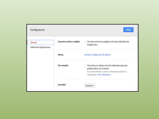 Google Drive es un programa de almacenamiento en la nube que permite a los usuarios subir, organizar y compartir archivos y carpetas desde cualquier dispositivo con conexión a Internet. Los usuarios pueden crear, editar y colaborar en documentos, hojas de cálculo y presentaciones almacenados en Google Drive. El programa ofrece 15 GB de almacenamiento gratuito y permite a los usuarios compartir archivos y carpetas por correo electrónico o enlace para que otros puedan verlos y editarlos.