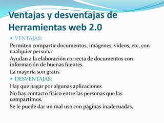 El documento describe las ventajas y desventajas de las herramientas web 2.0 y Google Drive. Entre las ventajas se encuentran la capacidad de compartir documentos, imágenes y videos con otros de manera gratuita y elaborar documentos con buenas fuentes de información. Algunas desventajas son que algunas aplicaciones requieren pago, falta de contacto físico entre usuarios y posibilidad de acceso a contenido inadecuado. Para Google Drive, las ventajas incluyen compartir archivos de forma segura de manera gratuita, pero las desvent