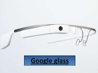 Google Glass es un ordenador portátil con pantalla montada en gafas que permite interactuar con internet mediante comandos de voz y muestra información como un smartphone. Sus características incluyen una pantalla de alta resolución, cámara de 5 megapíxeles, memoria de 16GB y duración de batería de un día. Requiere la aplicación MyGlass para vincular el teléfono y controlar las gafas de forma remota.