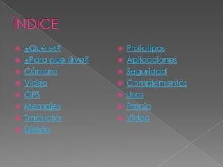 Las Google Glass son un dispositivo de realidad aumentada desarrollado por Google que se coloca como gafas y permite acceder a información a través de comandos de voz sin necesidad de usar las manos. El documento describe las funciones de las Google Glass como cámara, video, GPS, mensajería y traducción, así como sus aplicaciones, diseños, prototipos, seguridad y usos como por la policía. Finalmente, habla sobre el precio inicial de las Google Glass y su esperado menor coste con nuevos modelos.