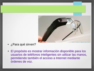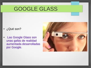 Las Google Glass son unas gafas de realidad aumentada desarrolladas por Google que permiten mostrar información a los usuarios sin utilizar las manos mediante órdenes de voz y acceso a Internet, fueron inventadas por Google+ y llevan en el mercado 2 años y media probando su funcionamiento, tienen una pantalla de 640x360 y 5 megapíxeles de cámara.