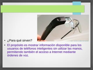 Las Google Glass son unas gafas de realidad aumentada desarrolladas por Google que permiten mostrar información a los usuarios sin utilizar las manos mediante órdenes de voz y acceso a Internet, fueron inventadas por Google+ y llevan en el mercado 2 años y media siendo probadas, tienen una pantalla de 640x360 y 5 megapíxeles de cámara.