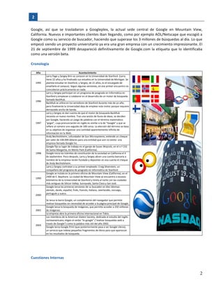 Larry Page y Sergey Brin fundaron Google en 1998 después de desarrollar un motor de búsqueda superior mientras estudiaban en la Universidad de Stanford. Recibieron fondos iniciales de Andy Bechtolsheim y lanzaron oficialmente Google como empresa en septiembre de 1998, operando desde oficinas en Menlo Park, California. Google rápidamente ganó popularidad y para 1999 había recaudado $25 millones de inversionistas adicionales, mudándose a su sede actual en Mountain View.