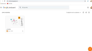 El documento explica las funciones básicas de Google Jamboard, incluyendo cómo crear y guardar jams, escribir, dibujar e insertar notas, imágenes y archivos, compartir jams con otros usuarios, convertir una jam a PDF, cambiar fondos y borrar marcos y jams. Proporciona instrucciones detalladas sobre cómo utilizar cada una de estas funciones de Jamboard.