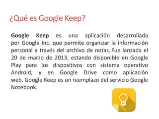 Google Keep es una aplicación desarrollada por Google para organizar notas personales a través de archivos de texto, voz e imágenes que se sincronizan mediante Google Drive. Permite crear y organizar notas de forma sencilla en dispositivos Android y como aplicación web en Google Drive.