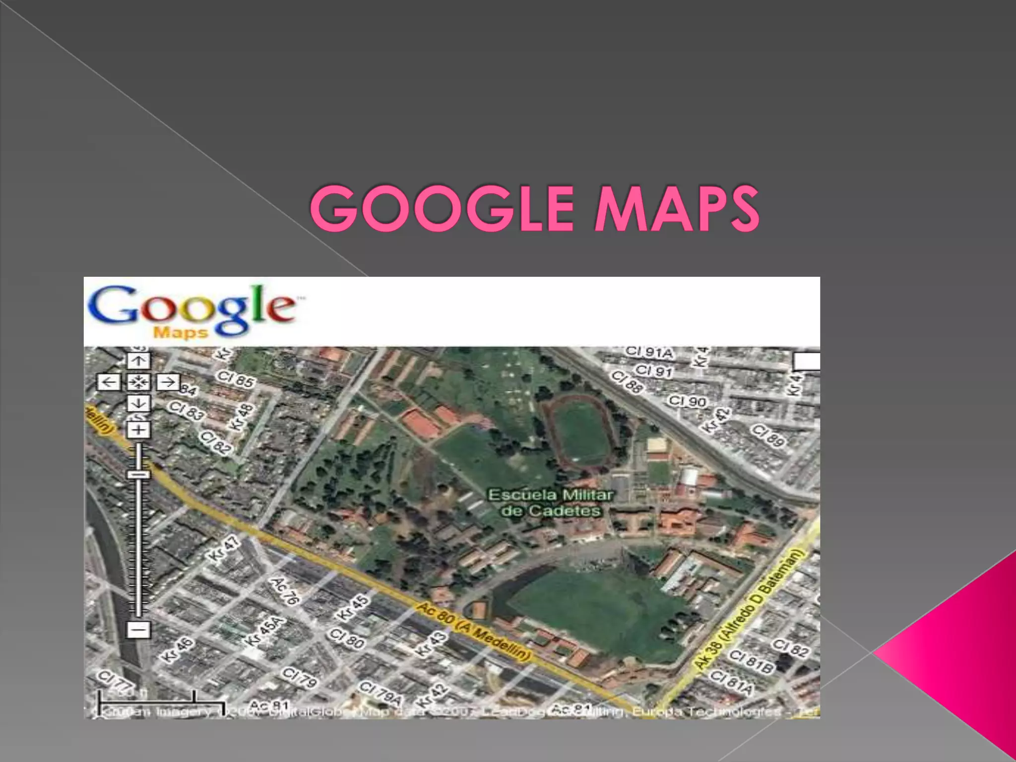 Google Maps es un servicio gratuito de Google que ofrece mapas interactivos del mundo con imágenes satelitales y callejeras. Los usuarios pueden buscar ubicaciones, hacer zoom en áreas de interés y obtener instrucciones de rutas. Además, permite integrar mapas en páginas web.