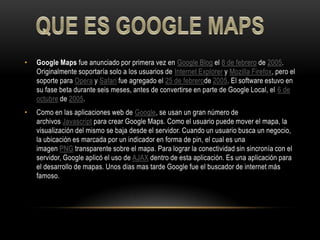 Google Maps fue anunciado por primera vez en 2005 y estuvo en fase beta durante seis meses antes de convertirse en parte de Google Local. Usa archivos Javascript para crear el mapa y descargar la visualización del servidor cuando el usuario se mueve. Permite buscar ubicaciones, acercar y alejar el mapa, y calcular direcciones y rutas entre lugares. Los desarrolladores pueden crear nuevas aplicaciones usando las APIs de Google Maps.